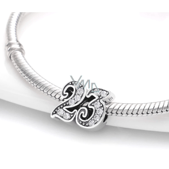 Tento přívěsek ze sterlingového stříbra pro náramky, vyrobený na oslavu 23. výročí nebo nezbedných 23 narozenin, je zvýrazněn kubickými Zirkony a korálkovými detaily.