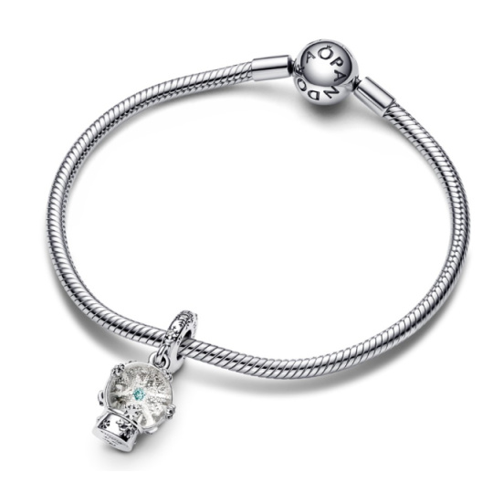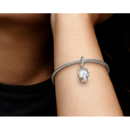 Złap odrobinę magii świątecznych chwil wiszącym charms Sněžęka z śnieżnymi płatkami. Zawieszka ze srebra i szkła Murano tworzy motyw śnieżnego płatka otoczonego kryształkami w szklanej kuli, co wywołuje osobisty magiczny efekt. Dopracowany element wymaga wysokiej precyzji ręcznej pracy, ponieważ zawiera wiele detali, w tym trzymane i wypolerowane śnieżne płatki na podstawie, rozproszone w kuli śnieżnej i na zawieszce. Po obróceniu zawieszki można zobaczyć napis wygrawerowany na podstawie „One in a Million“ (Jedna z miliona). Specjalny prezent dla ukochanej osoby lub magiczny dodatek do stylizacji biżuterii.