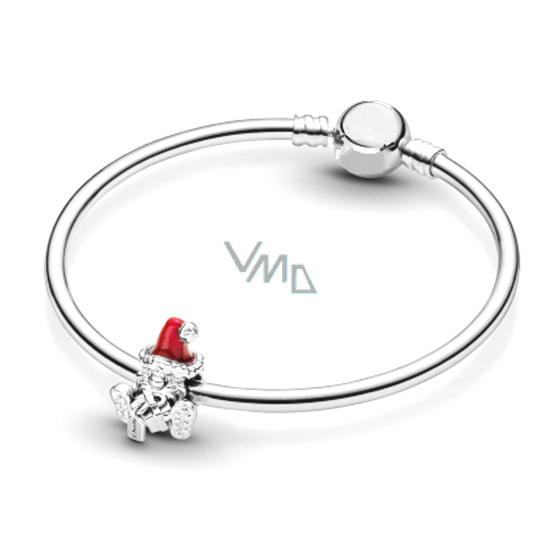 Bożonarodzeniowy charms ze srebra próby 925, ozdobiony emalią. Koralik Święty Mikołaj w dużej, świątecznej czapce siedzi na podłodze z bożonarodzeniowym prezentem między nogami. Duża czerwona czapka zakrywa oczy, prezent z kokardką ma małą wstążkę z pozdrowieniem, etykieta ma napis, Mikołaj ma wyraźnie duży nos, na podeszwie butów jest wzór serca. Koralik jest inspirowany magicznym czasem Bożego Narodzenia. Napis: "X Santa"