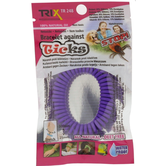 Pružný veľmi kvalitný silikónový náramok odpudzujúci kliešte, napustený prírodným olejom z Eukalyptu, ktorý je účinný v boji proti kliešťom. Vďaka použitému materiálu je náramok pružný a vodeodolný.