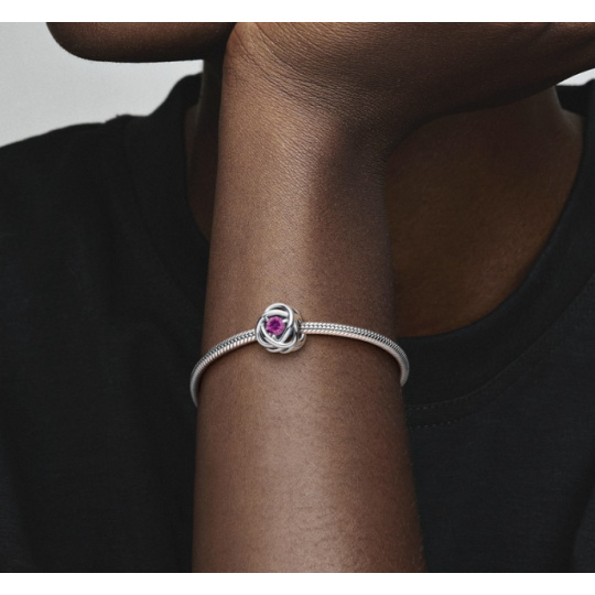 Stříbrný korálek s motivem věčnosti. Dodejte svým náramkům a přívěskům šmrnc pomocí tohoto věčného kruhu. Tento speciální kousek je vyroben ve tvaru nekonečného copu a ve svém středu je osazen růžovým krystalem. Symbolizující věčnost, přidejte toto jiskřivé kouzlo do svého stylu, aby vaše každodenní šperky získaly jasnou aktualizaci.