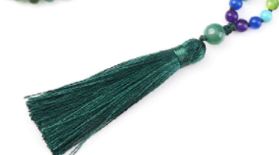 Diskuze k produktu 108 Mala 7 čakrový náhrdelník, Achát zelený meditační šperk, přírodní kámen vázaný, elastický, střapec 8 cm, korálek 6 mm