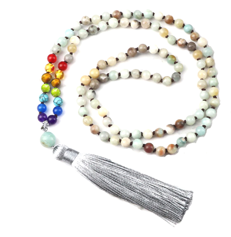 108 Mala 7 čakrový náhrdelník, Amazonit, meditační šperk, přírodní kámen vázaný, elastický, střapec 8 cm, korálek 6 mm