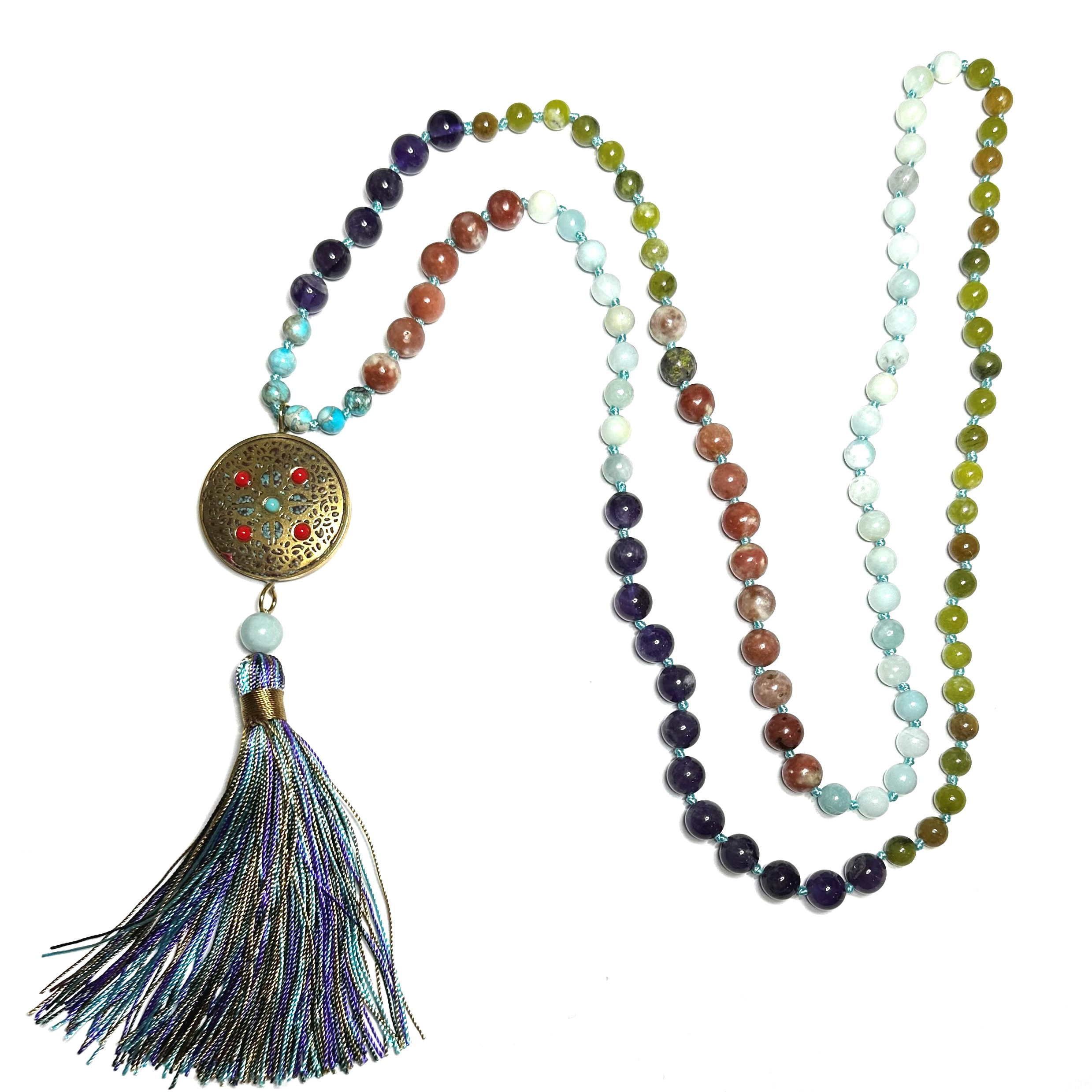 108 Mala 7 čakrový náhrdelník, meditační šperk, přírodní kámen, vázaný, střapec 9 cm, korálek 6+8 mm