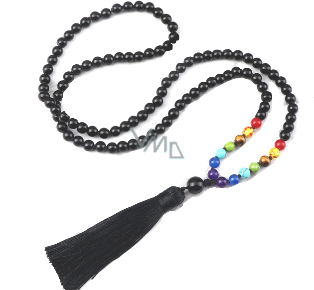 108 Mala 7 čakrový náhrdelník, Onyx meditační šperk, přírodní kámen vázaný, elastický, střapec 8 cm, korálek 6 mm
