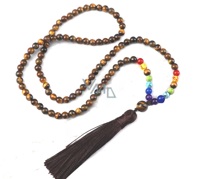108 Mala 7 čakrový náhrdelník, Tygří oko meditační šperk, přírodní kámen, vázaný střapec 8 cm, korálek 6 mm