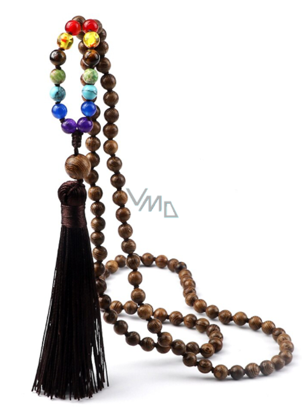108 Mala 7 čakrový náhrdelník, dřevěné korálky meditační růženec, střapec 8,5 cm, korálek 6 mm