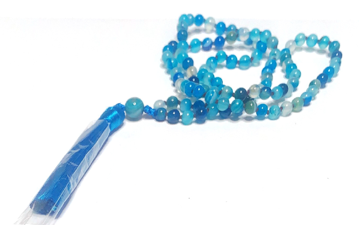 108 Mala Achát modrý náhrdelník, meditační šperk, přírodní kámen vázaný, elastický, střapec 8 cm, korálek 6mm