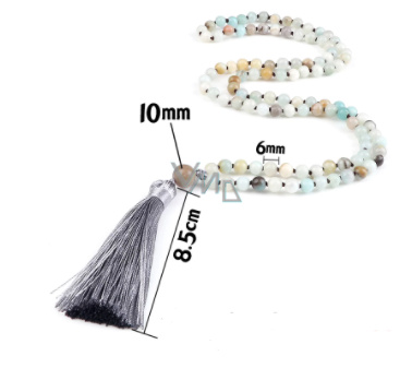 108 Mala Amazonit náhrdelník, meditační šperk, přírodní kámen, šedý střapec 8,5 cm, korálek 6 mm