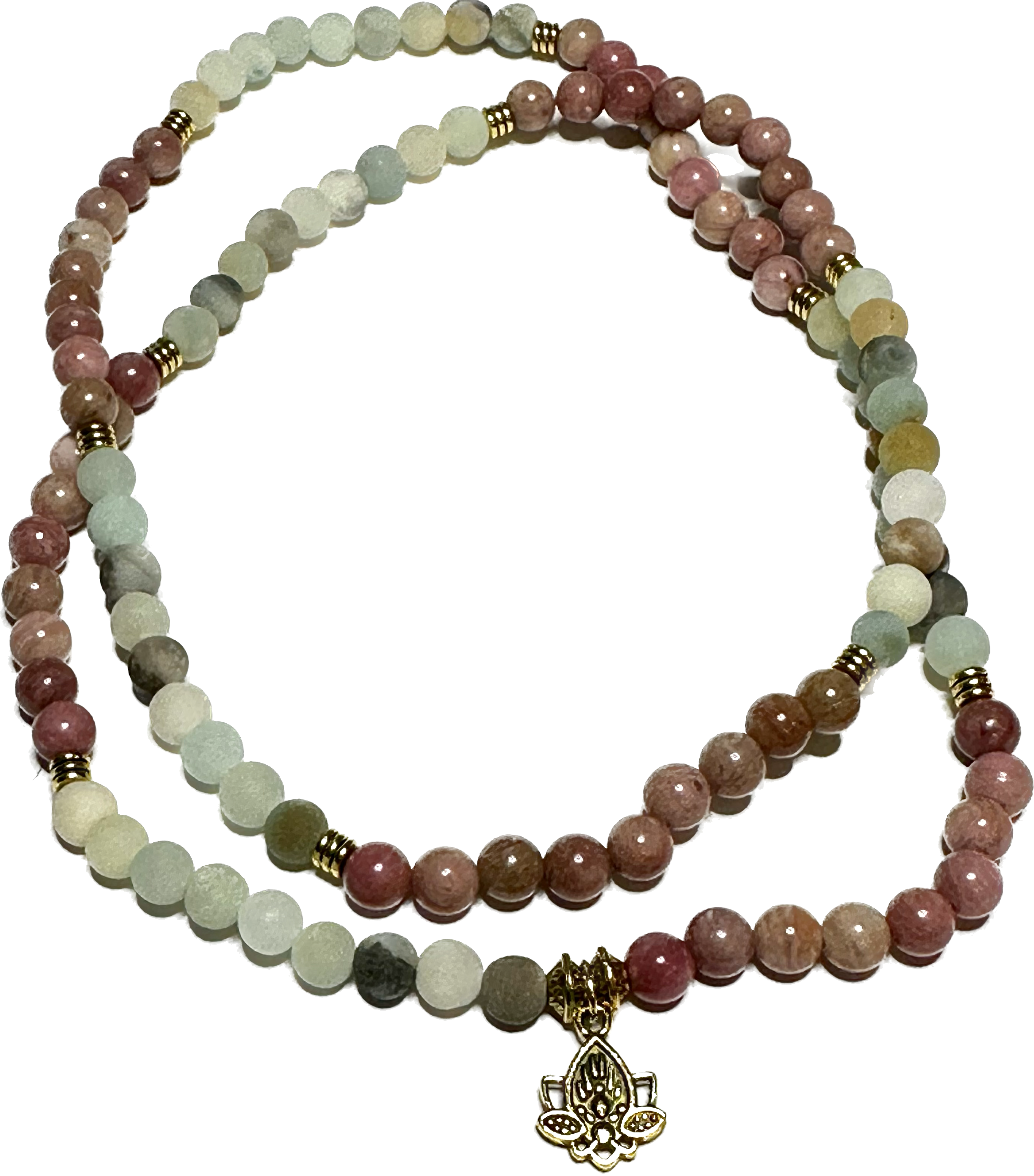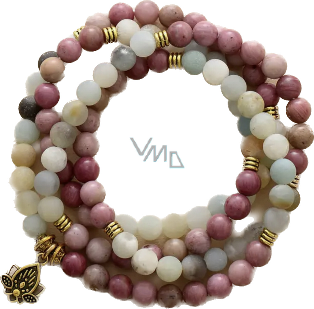 108 Mala Amazonit + Rodonit + Lotos náhrdelník meditační šperk, přírodní kámen, kulička 6 mm