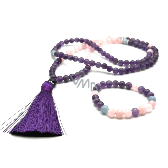 108 Mala Ametyst + Růženin náhrdelník meditační šperk, přírodní kámen + náramek přírodní kámen, kulička 8 mm