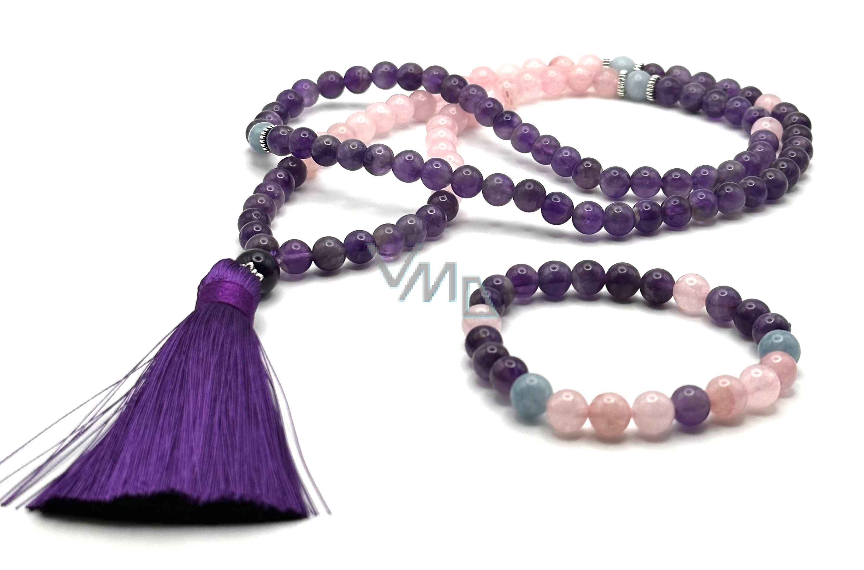 108 Mala Ametyst + Růženin náhrdelník meditační šperk, přírodní kámen + náramek přírodní kámen, kulička 8 mm