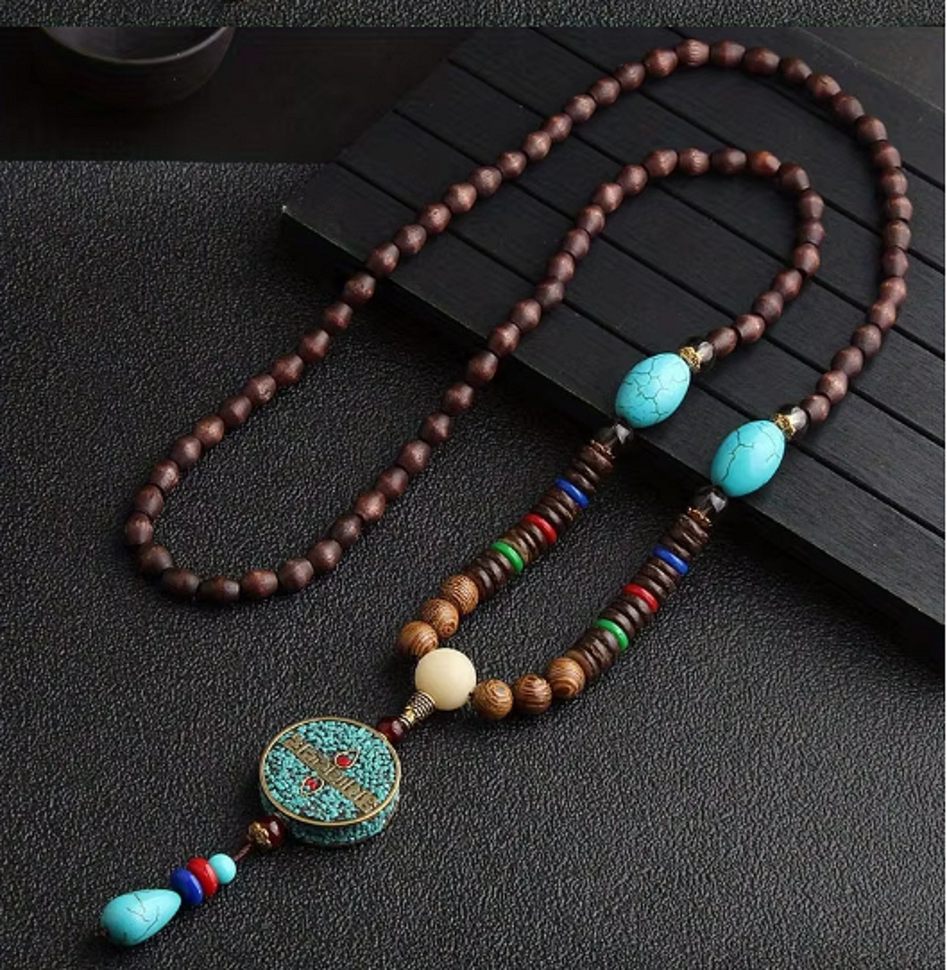 „Klid, který si nesete s sebou.“ Tento dlouhý náhrdelník typu Mala (108 korálků) propojuje přírodní dřevo, výrazné tyrkysové prvky a symbolický amulet v harmonickém designu, který působí klidně, vyrovnaně a zároveň velmi stylově.