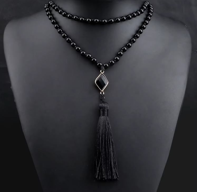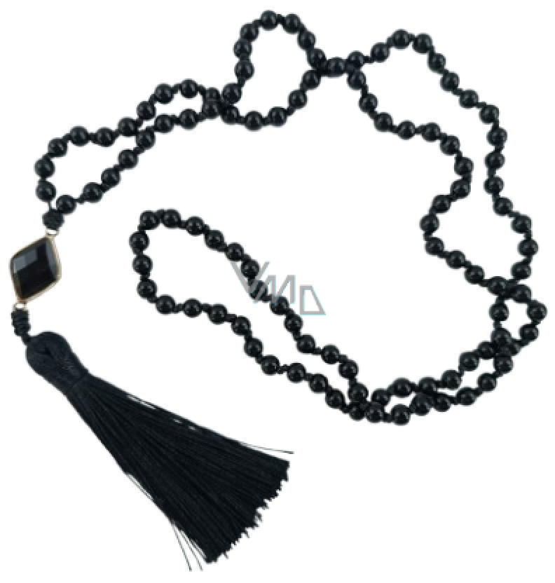 108 Mala Obsidian náhrdelník kosočtverec, meditační šperk, přírodní kámen vázaný, elastický, korálek 6 mm, kámen záchrany
