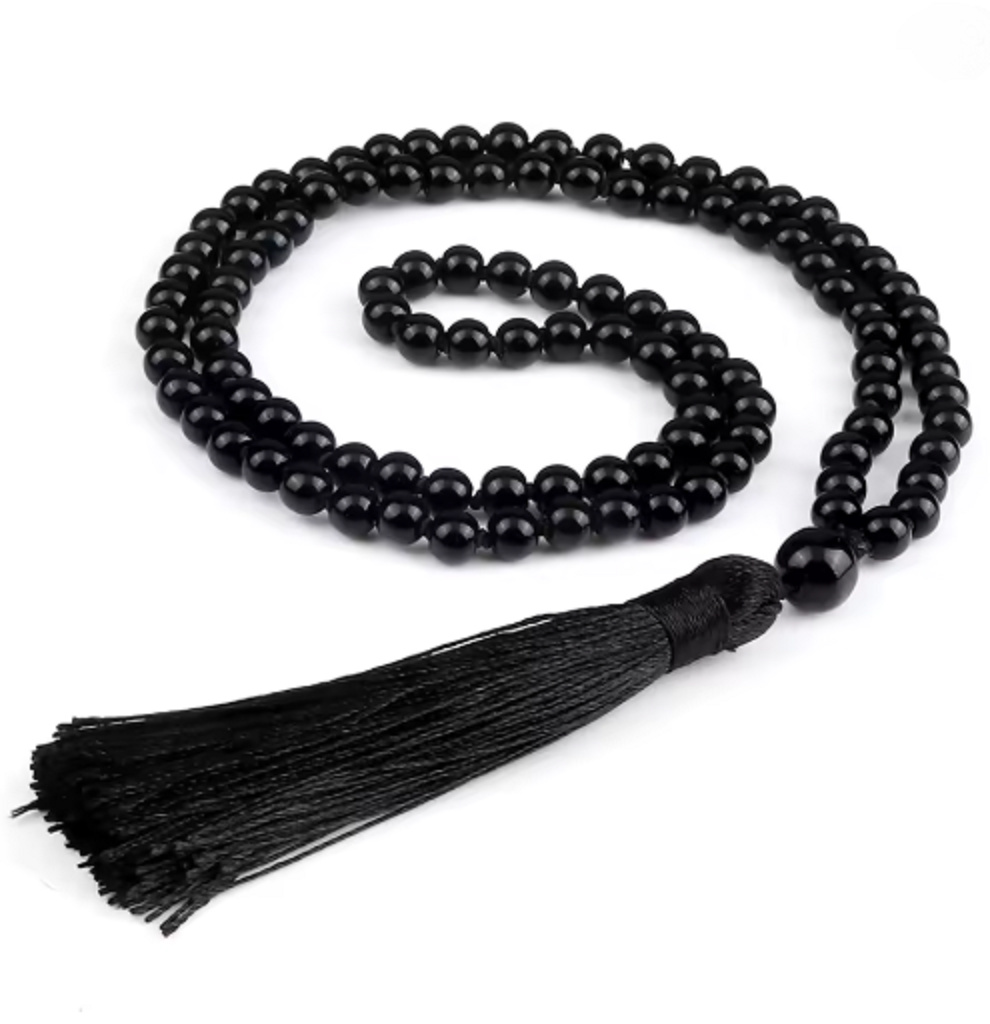108 Mala Onyx mat náhrdelník meditační šperk, přírodní kámen, vázaný střapec, korálek 6 mm matný