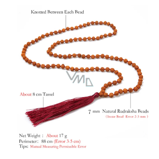 Objevte sílu přírodního Rudraksha náhrdelníku, který spojuje tradiční duchovní symboliku s precizním ručním zpracováním. Tento mala náhrdelník je tvořen 108 přírodními korálky Rudraksha o průměru cca 7 mm, přičemž každý korálek je pečlivě uzlovaný pro snadné počítání při meditaci či modlitbě.