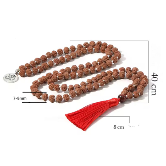Tradiční meditační náhrdelník Rudraksha s duchovním symbolem Óm a červenou třásní pro harmonii těla i mysli. Ručně vázaný, vyrobený z přírodních semen Rudraksha, 108 korálků doplněných dekoračními korálky a kovovým přívěskem.