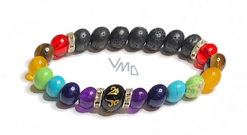 Čakrový Láva náramek s královskou mantrou Óm náramek elastický přírodní kámen, kulička 8 mm / 16 - 17 cm