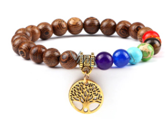 Čakrový náramek Strom života + dřevo, elastický, kulička 8 mm / 16 - 17 cm