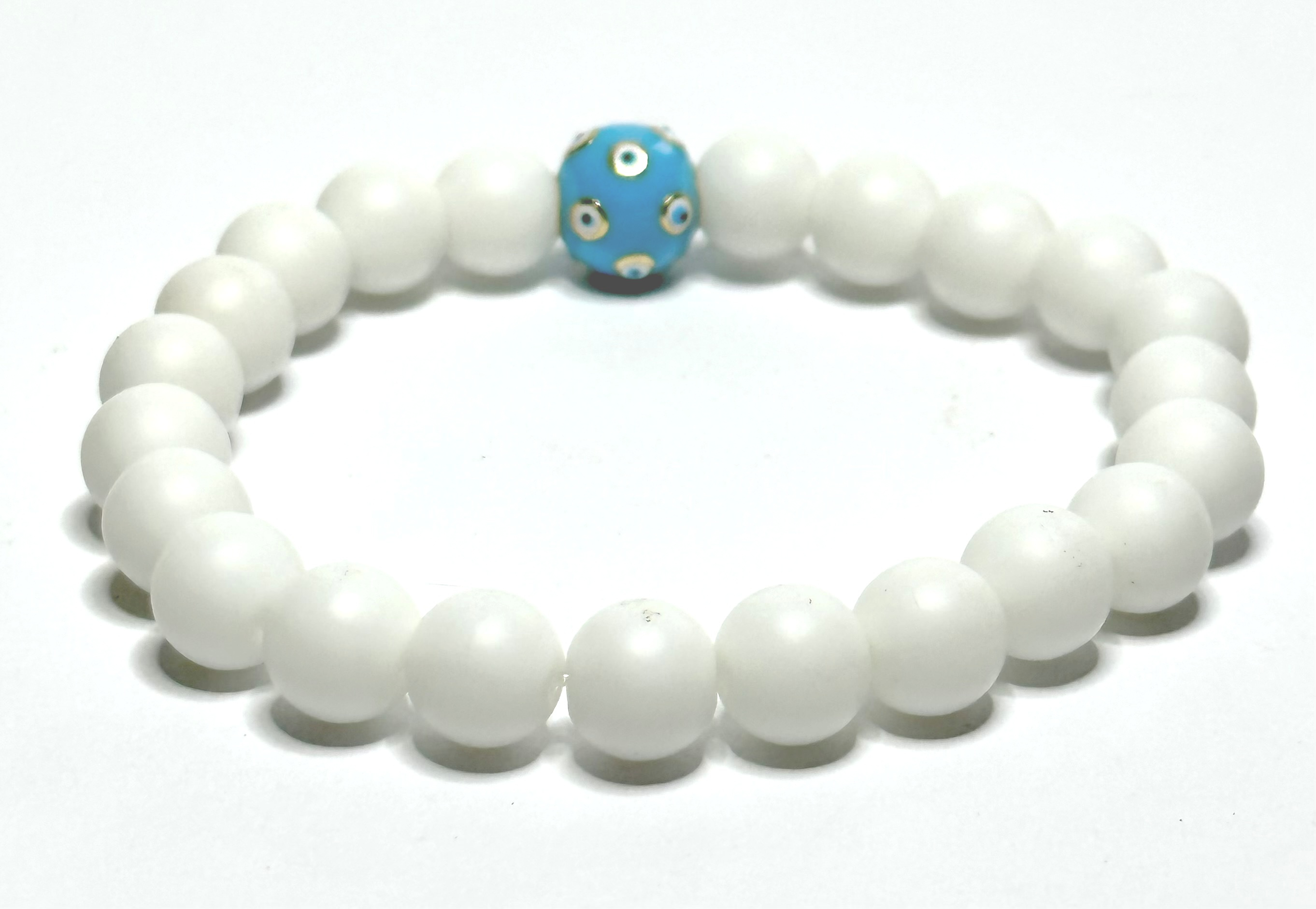 Achát bílý matný + Modré oko náramek elastický přírodní kámen, kulička 8 mm / 16 - 17 cm, poskytuje klid a mír