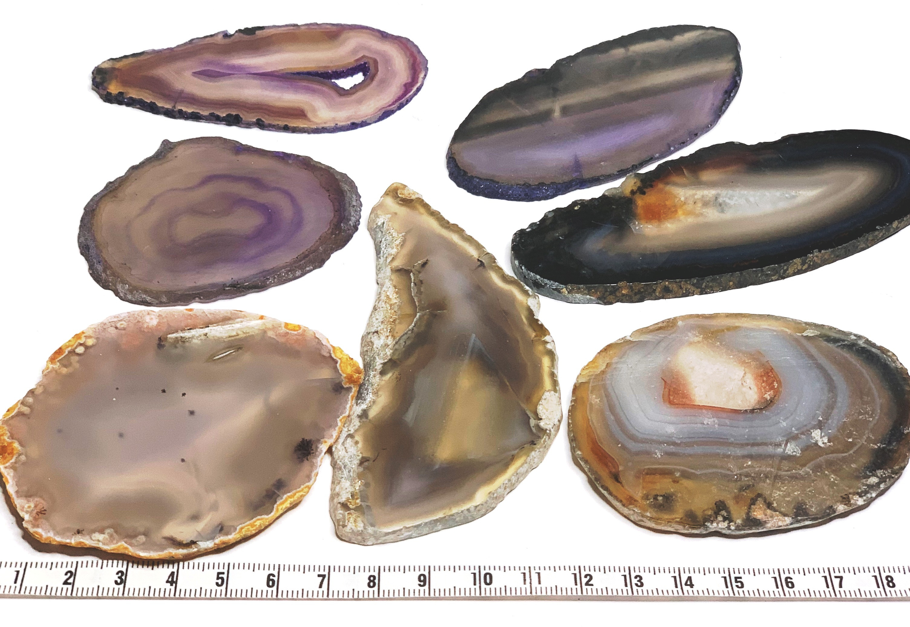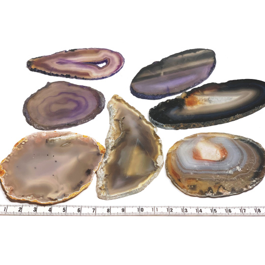 Další z řady vzácných achátů, tentokrát původem z Botswany. Jde o sběratelské kousky, protože vláda po vyhlášení nezávislé Botswany zakázala vývoz neopracovaných surových achátů a embargo trvá dodnes. Botswanské acháty vynikají výrazným proužkováním. Ostrý kontrast mezi bílými a tmavými proužky často doplňuje červený střed (obarvený Oxidy železa), který celkovému vzhledu dodává ještě větší dynamiku.