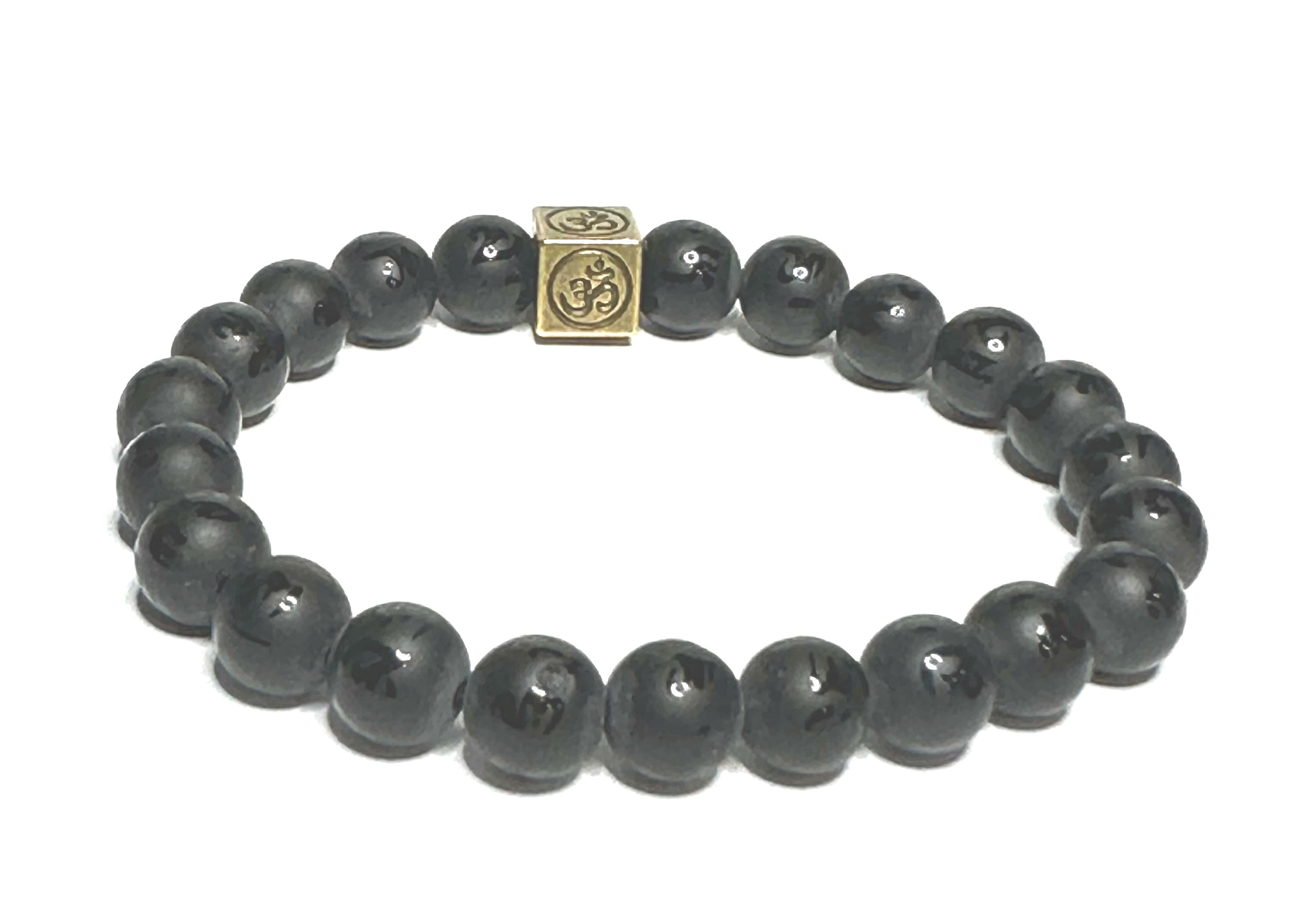 Achát černý matný s královskou mantrou Óm náramek elastický přírodní kámen, kulička 8 mm / 16 - 17 cm, dodává odvahu a sílu