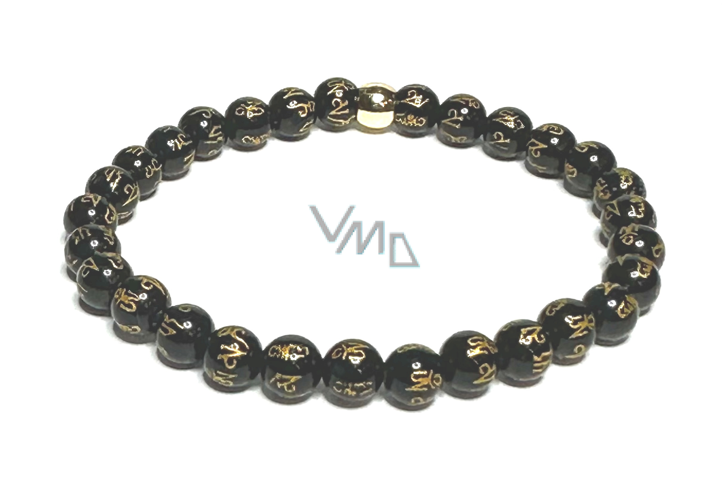 Achát černý s královskou mantrou Óm náramek elastický přírodní kámen, kulička 6 mm / 16 - 17 cm, dodává odvahu a sílu