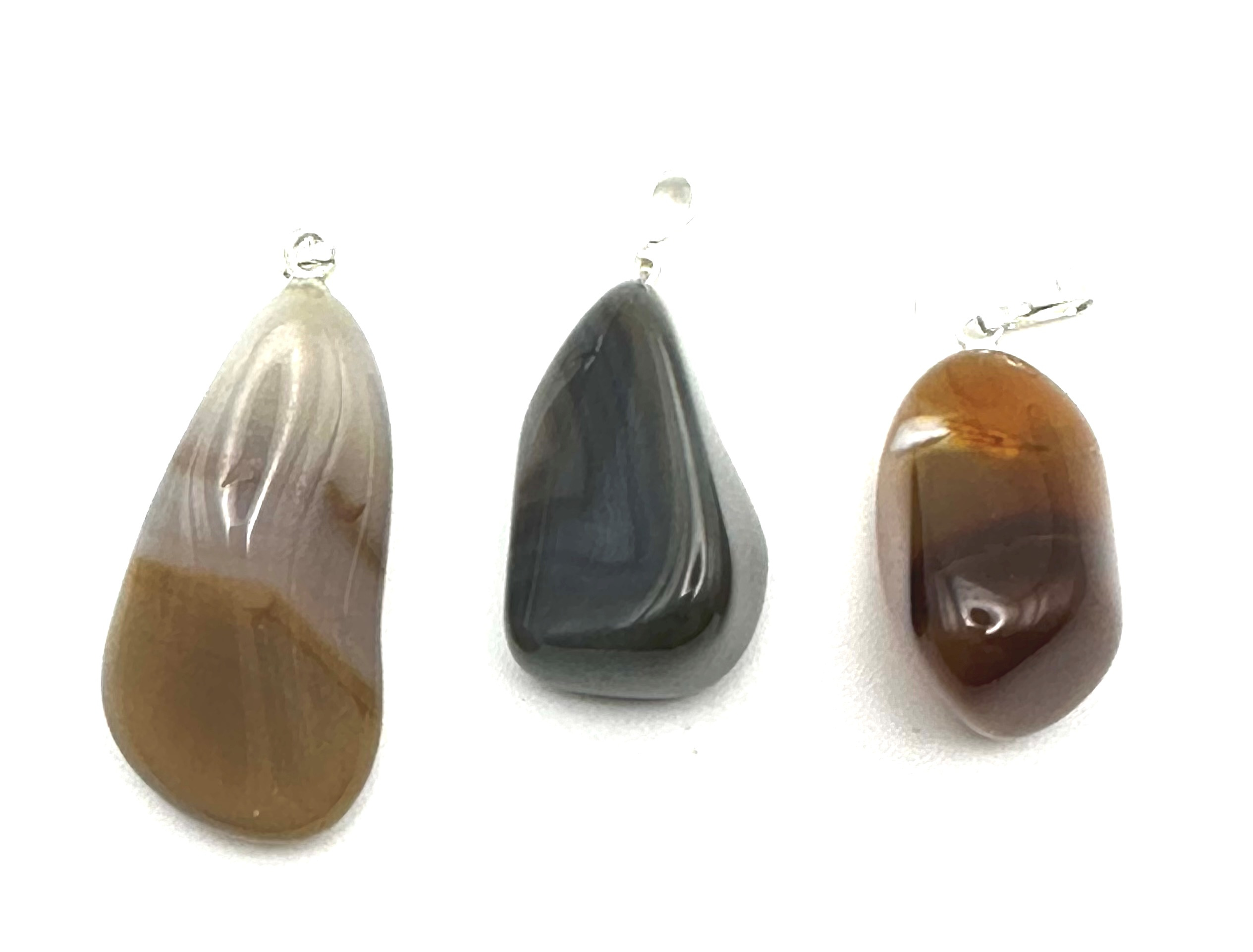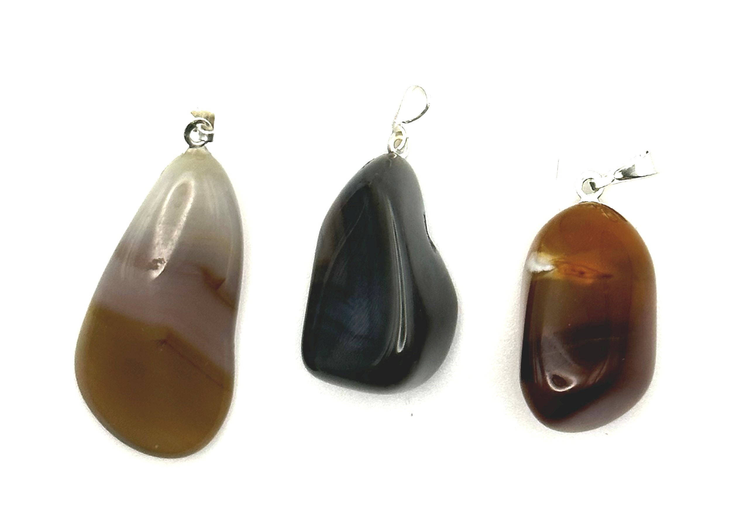 Achát je minerál, který tvoří různě zbarvené vrstvičky mikroskopického křemene, Chalcedonu a Opálu; ty kameni dodávají charakteristickou páskovanou kresbu. Kresba se pro větší efekt někdy zvýrazňuje dalším barvením, achát natur však nebyl obarven, zůstáva tak v jeho přírodní podobě se zemitými odstíny. Kameny pochází z Brazílie.