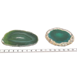 Pro acháty je charakteristická pestrobarevnost, tento druh přitom vyniká svými zelenými odstíny. Ty vznikají nasycením oxidy chromu a následným vypálením při vysoké teplotě. Původní technologie se dnes často nahrazuje studeným barvením, z něhož vychází spíše modrozelený odstín. V daném případě se kámen označuje jako Teal. Samozřejmě nechybí ani pro acháty tolik typické proužky. Surovina pochází z Brazílie.