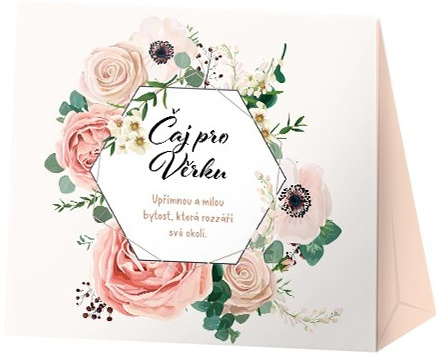 Sypaný ovocný čaj bez ibišku je balen v dárkové květinové krabičce s milým textem. Odpadá vám tak starost s balením dárku.