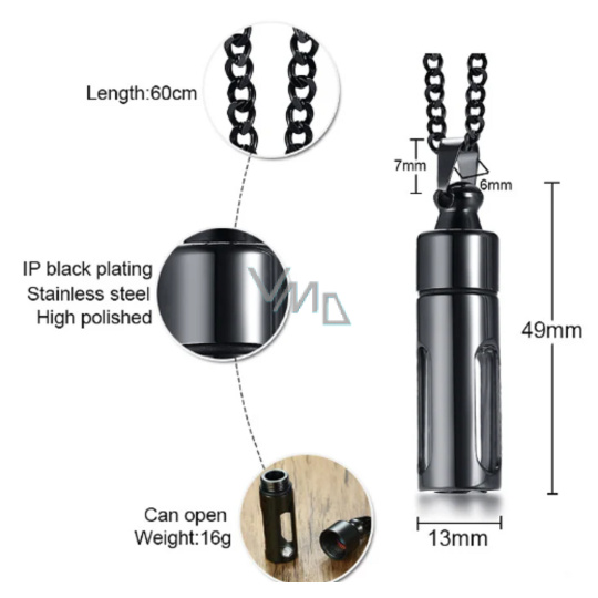 Pamětní, pietní urnový přívěsek, Dutá trubice, voděodolná, nerezová ocel, černá 13 mm x 49 mm + 60 cm řetízek
