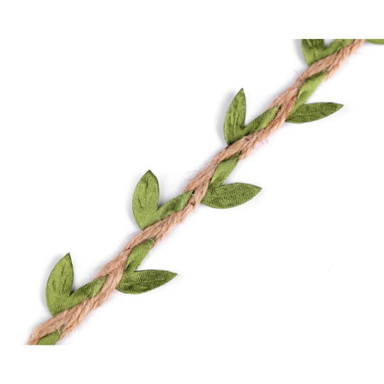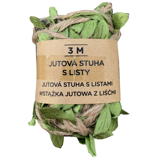 Jutové stuha s lístečky je elegantní, nadčasové a pevné. Vhodné k vánočnímu aranžmá. Stuha s listy je do prýmku zapletena, tím zajišťuje pravidelnost. Listy mají uprostřed vytlačené žilkování. Lze je použít při vazbě řezaných i sušených květin, ozdobit dárkové předměty nebo balíčky. Zabalte dárky jednoduše do balícího papíru a omotejte těmito krásnými veselými stuhami.