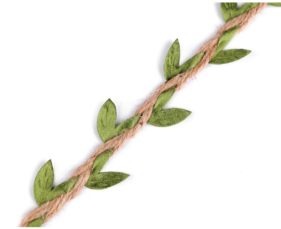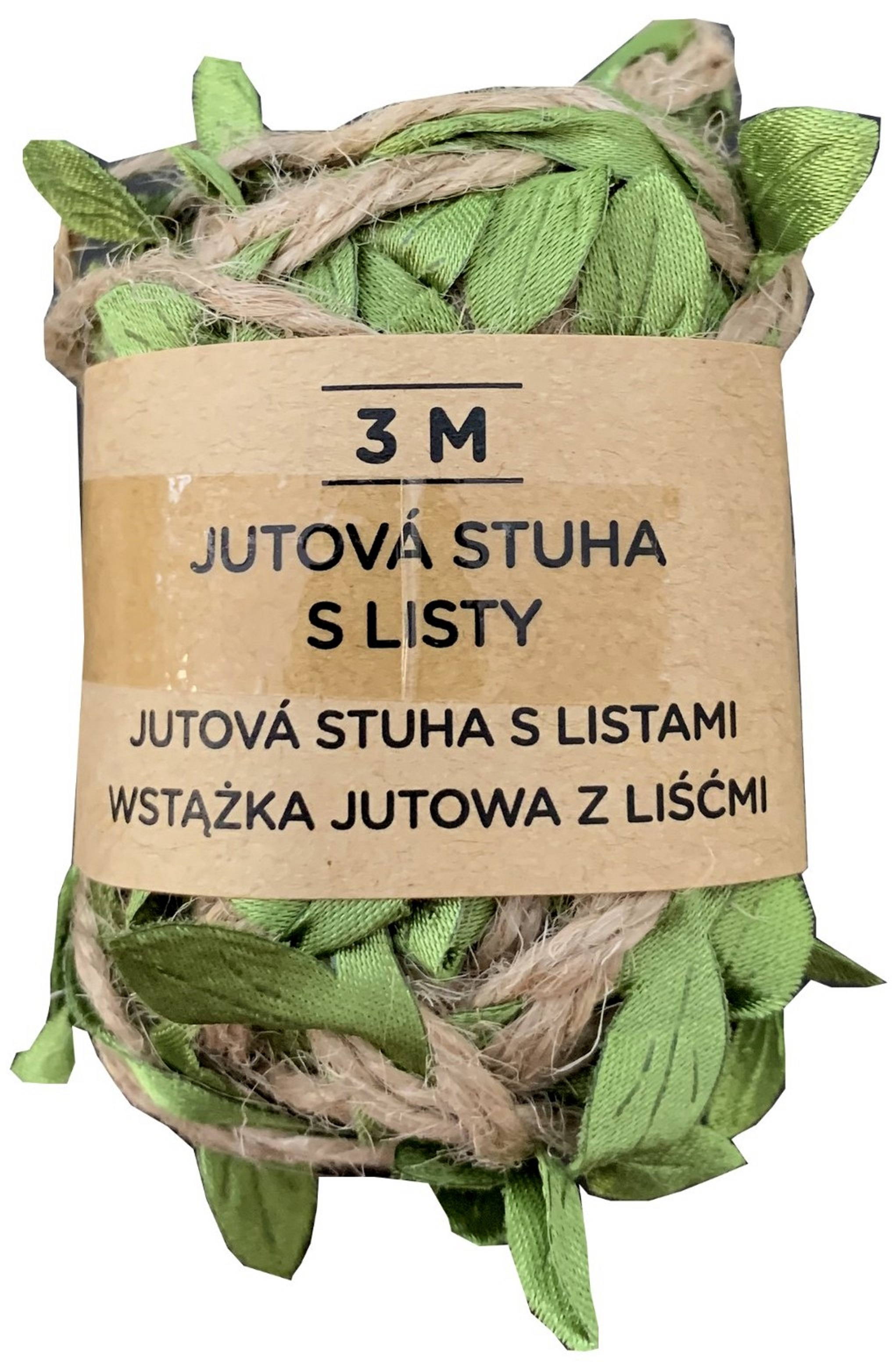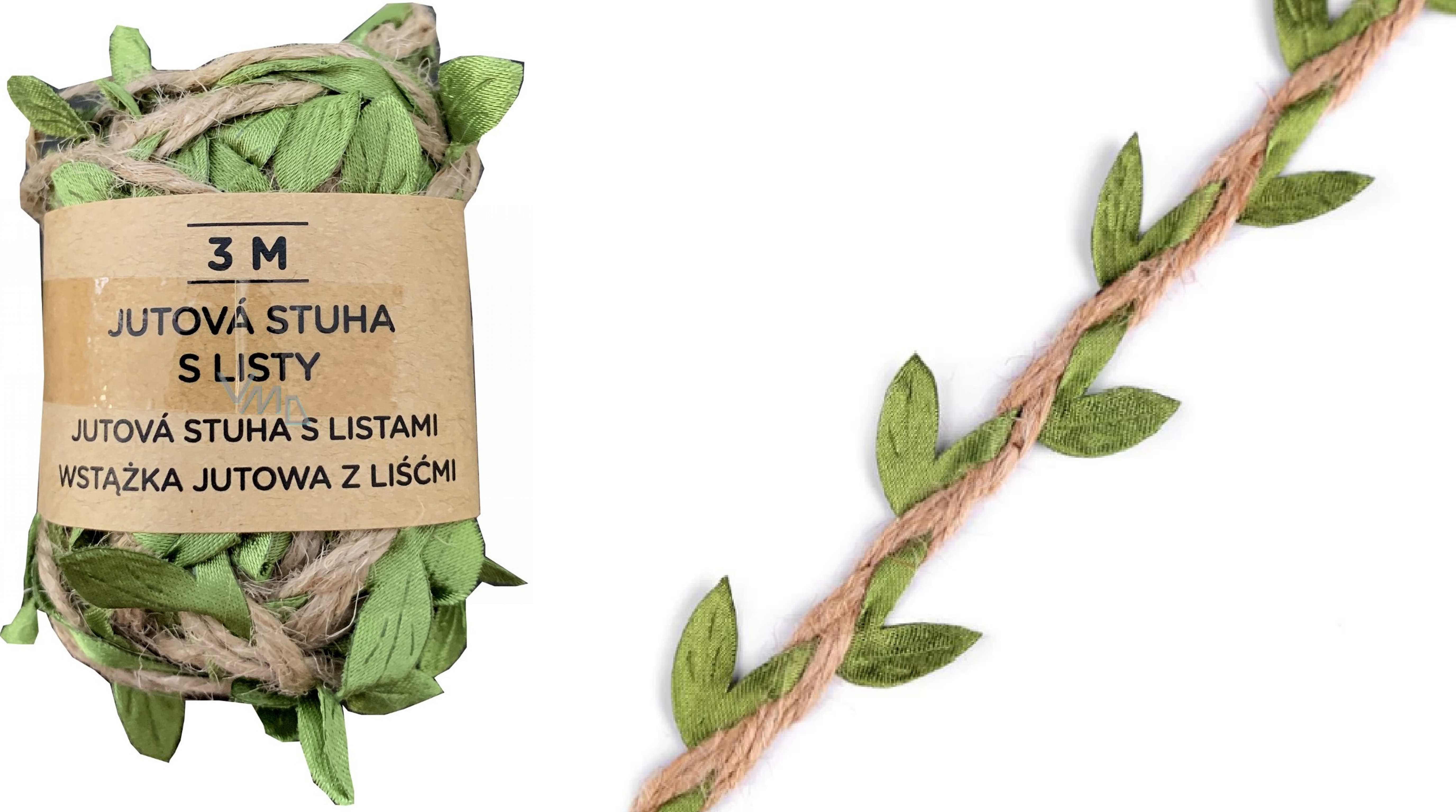 Jutové stuha s lístečky je elegantní, nadčasové a pevné. Vhodné k vánočnímu aranžmá. Stuha s listy je do prýmku zapletena, tím zajišťuje pravidelnost. Listy mají uprostřed vytlačené žilkování. Lze je použít při vazbě řezaných i sušených květin, ozdobit dárkové předměty nebo balíčky. Zabalte dárky jednoduše do balícího papíru a omotejte těmito krásnými veselými stuhami.