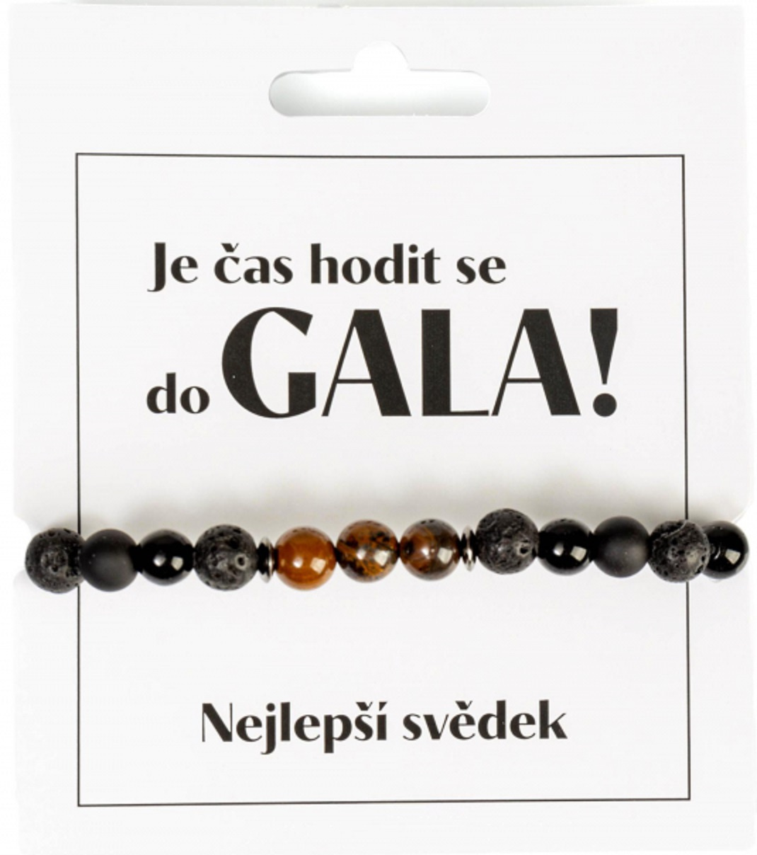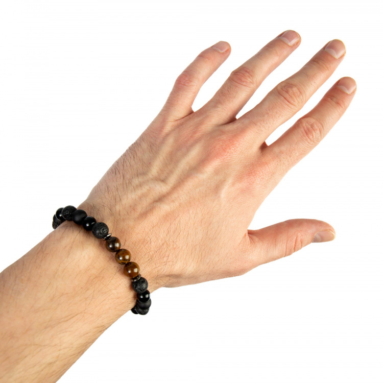 Stylový pánský náramek "Je čas hodit se do GALA!" z lávových kamenů je doplněn kamínky tygřího oka, které budou svého nositele ochraňovat.
