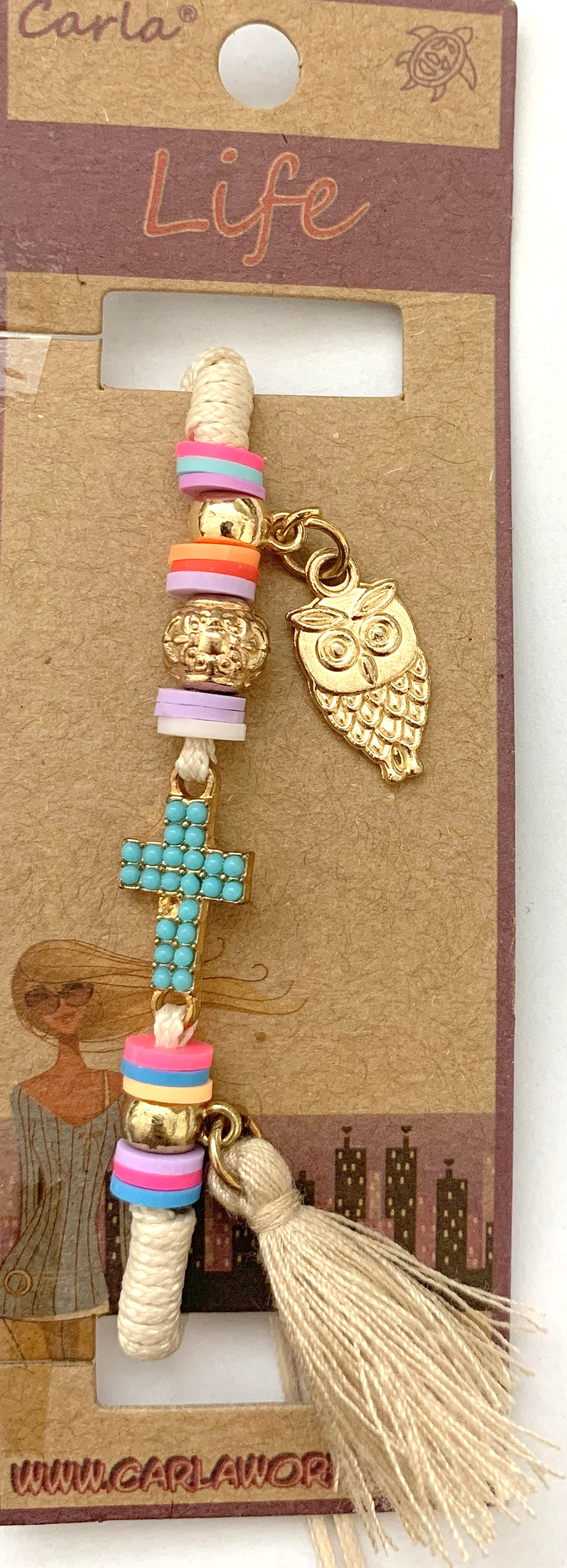 Albi Šperk náramek pletený Kříž láska, víra, naděje, Střapec ochrana, energie, Sova symbol moudrosti 1 kus různé barvy