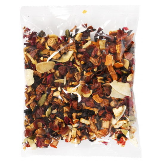 Jablka, Ibišek, Šípek, Pomerančová kůra, rozinky (rozinky, Slunečnicový olej), datle (datle, rýžová mouka), Meruňky (Meruňky, rýžová mouka, oxid siřičitý), Švestky (Švestky, Slunečnicový olej), poupata růží, Fíky (Fíky, rýžová mouka), kokos, Lékořice, kardamom, aroma, Mandle, růže, vanilka.