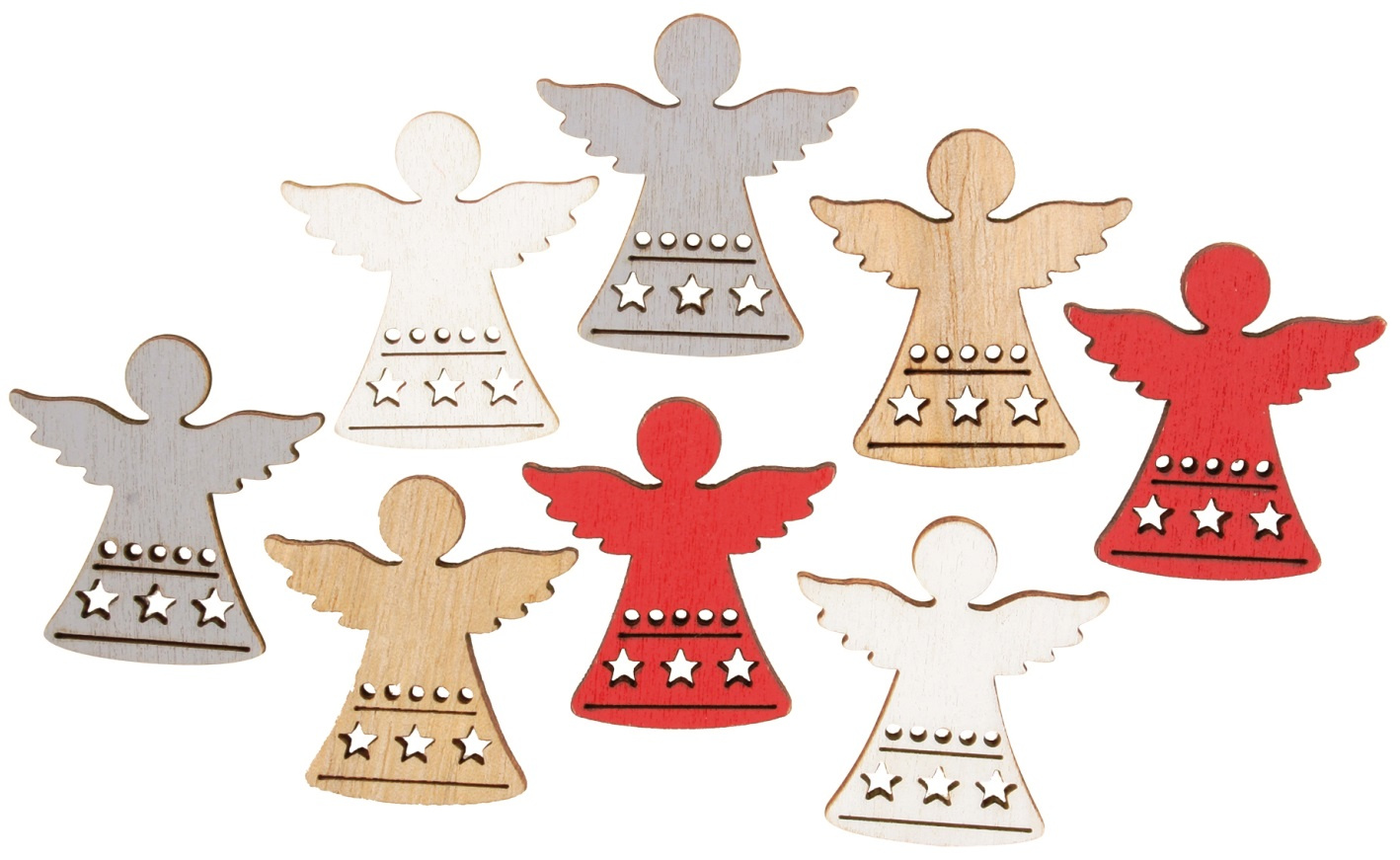 Anděl dřevěný červeno-stříbrno-bílo-hnědý 3,5 cm 8 kusů