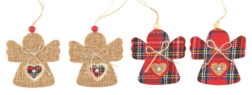 Anděl jutový a káro na zavěšení 7 cm 4 kusy v sáčku