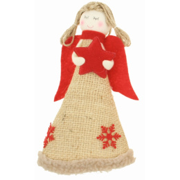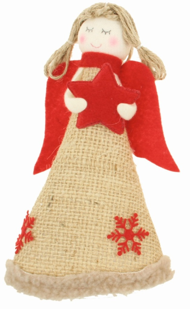 Anděl jutový s červenými křídly hvězda na postavení 19 cm