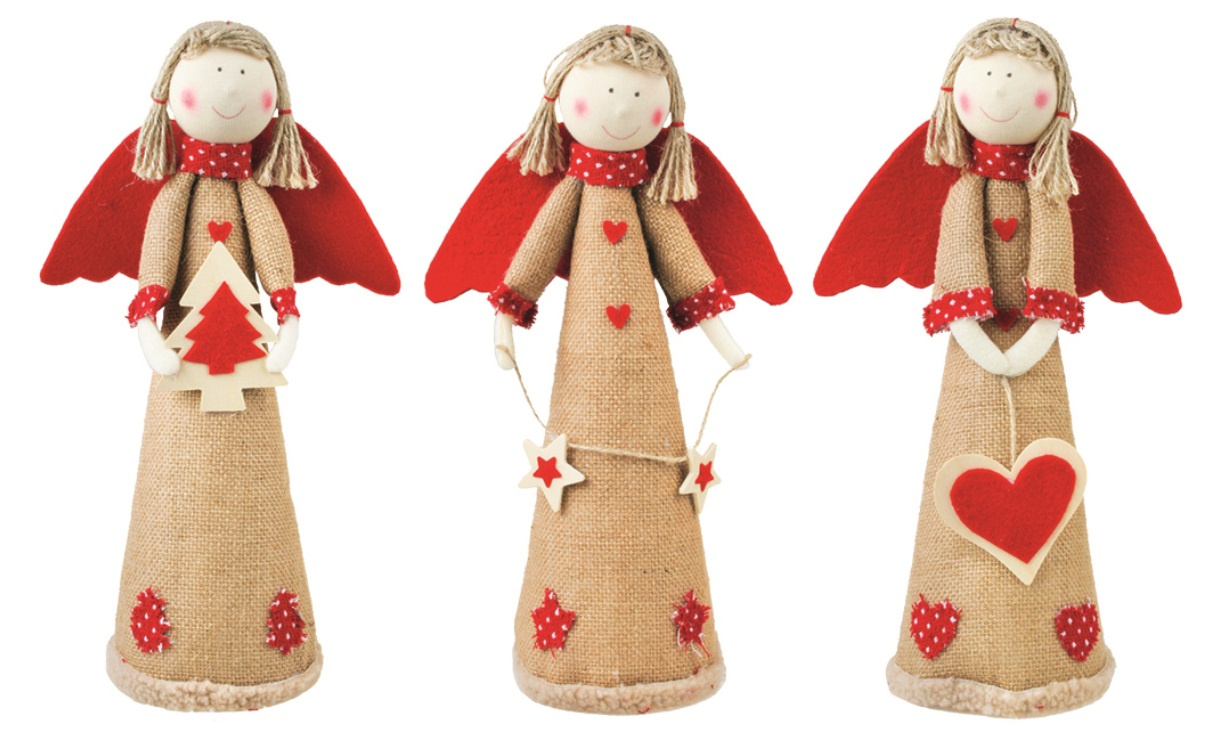 Anděl jutový s červenými křídly na postavení 37 cm 1 kus