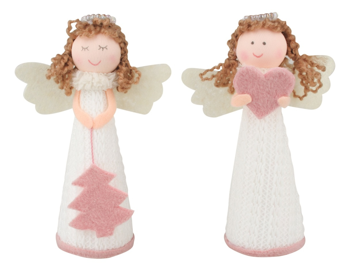 Anděl pletený bílý s růžovými doplňky na postavení 13 cm 1 kus