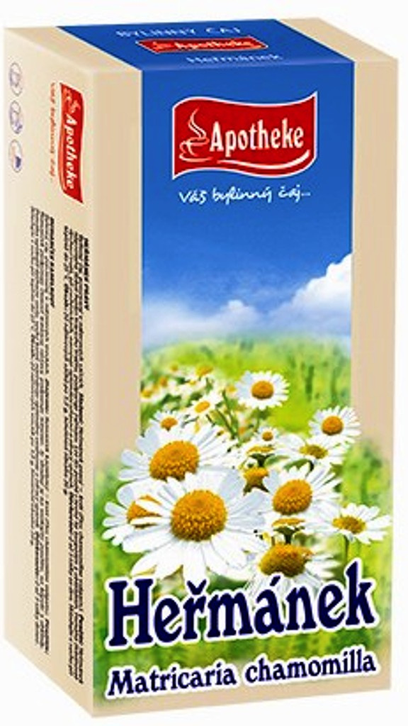 Přípravek Apotheke Heřmánek pravý čaj 20x1,5g je registrovaný jako doplněk stravy. Nemá schválené léčivé účinky a nejedná se o lék. Doplňky stravy nejsou určeny jako náhrada pestré stravy. Nepřekračujte doporučené dávkování.