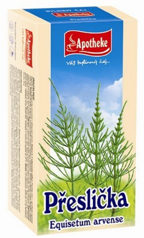 Apotheke Přeslička čaj je doplněk stravy ve formě bylinného porcovaného čaje v nálevových sáčcích. Přeslička rolní podporuje normální funkci močové soustavy a vylučování. Podporuje zdraví kloubů a má příznivé účinky na pokožku, vlasy a nehty.