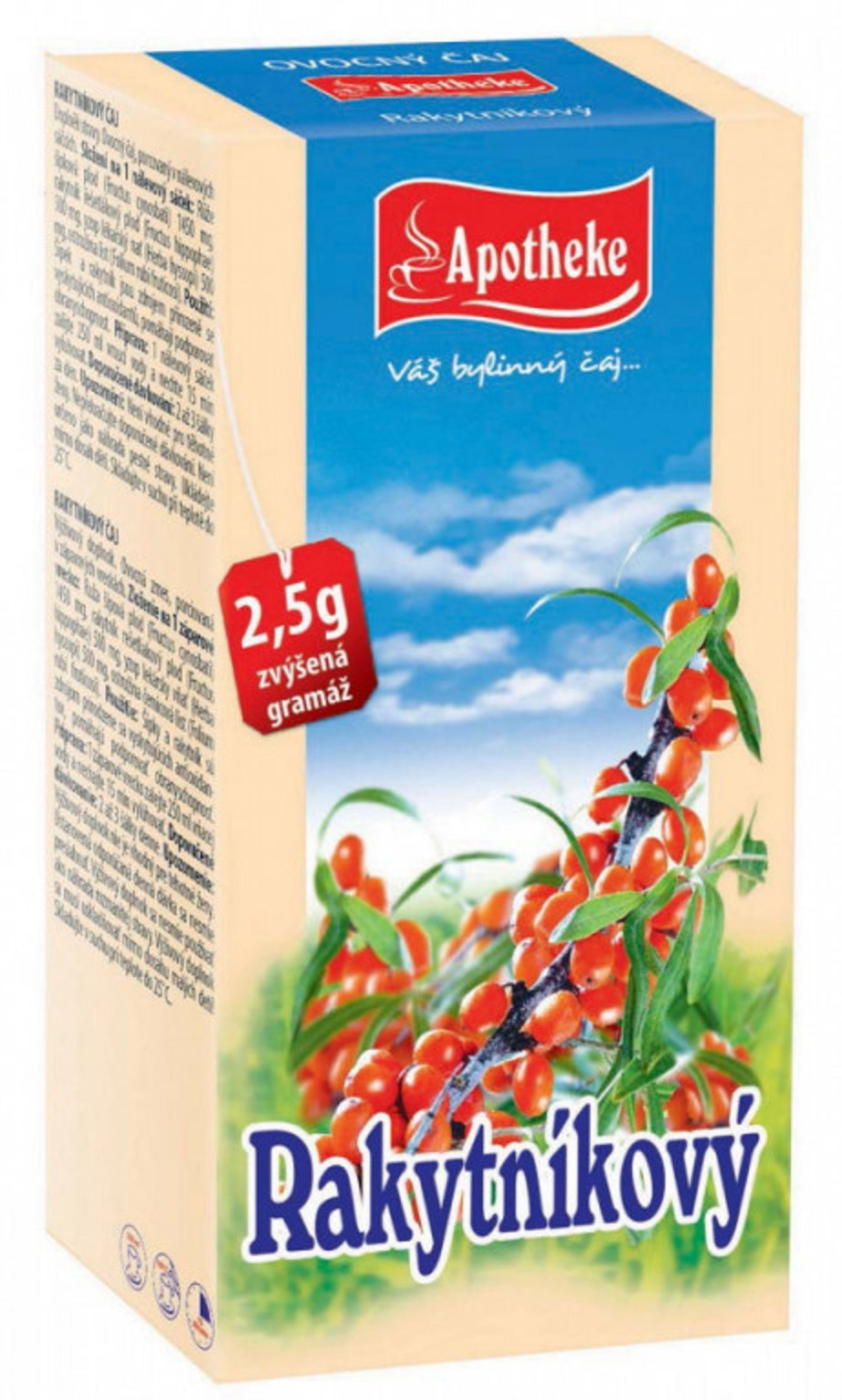 Přípravek Apotheke Rakytníkový čaj 20x2.5g je registrovaný jako doplněk stravy. Nemá schválené léčivé účinky a nejedná se o lék. Doplňky stravy nejsou určeny jako náhrada pestré stravy. Nepřekračujte doporučené dávkování.
