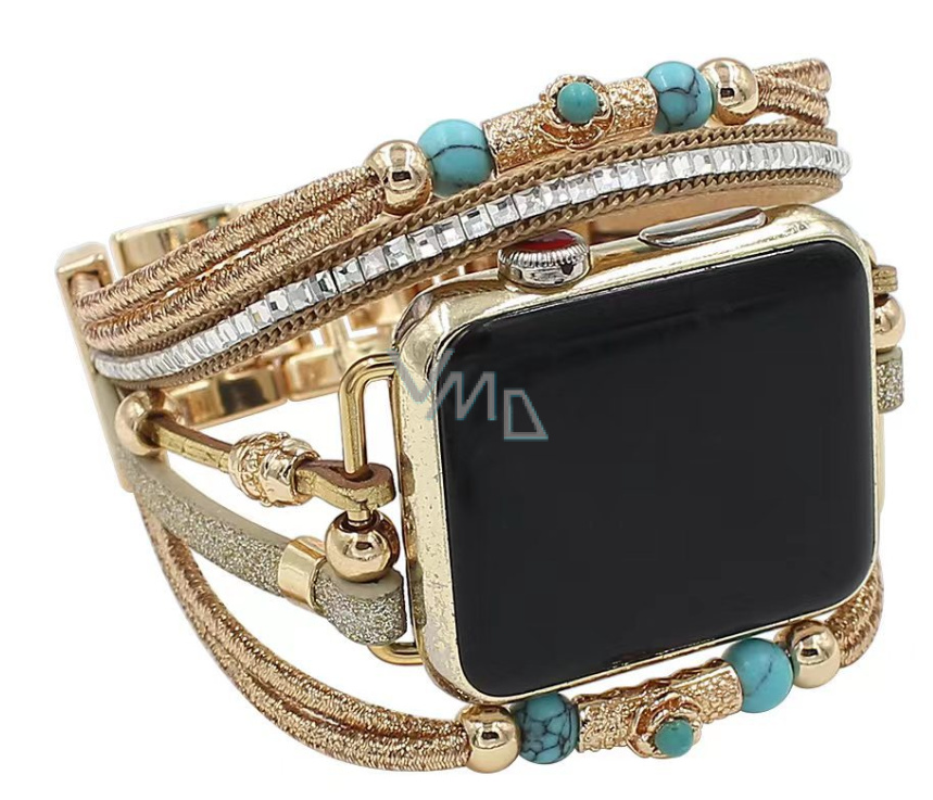 Apple Watch řemínek na hodinky ručně vyráběný Zlatý + korálky, velikost 38/40/41 mm