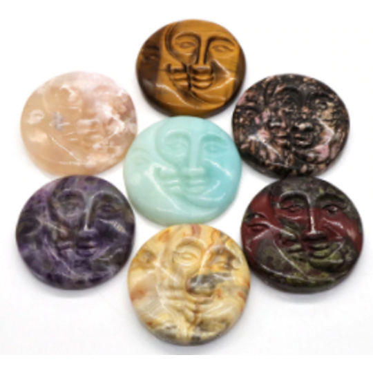 Aventurin zelený tvář slunce a měsíc ručně vyřezávaný přírodní kámen 5 cm, kámen štěstí