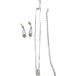 Souprava vyrobená z broušených stříbrných štrasových kamínků. Bižuterní kov má stříbrnou barvu. Zapínání náušnice na silikonovou puzetu. Sada je vhodná na svatbu, na ples nebo pro družičky, ale je vhodná i na běžné nošení.