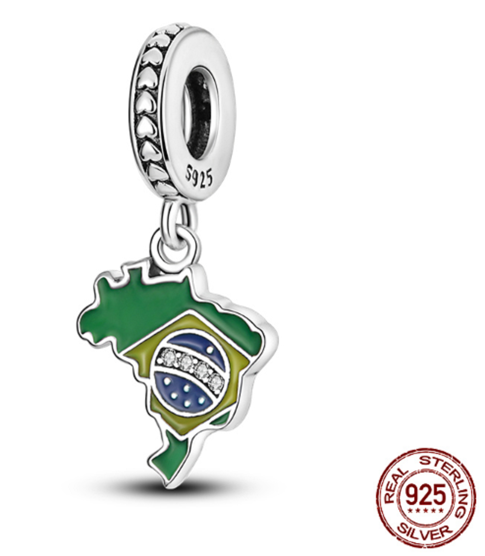 Charm Sterlingové stříbro 925 Brazílie vlajka - houpající se mapa, přívěsek na náramek cestování