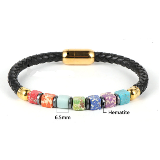 Sedm barevných korálků z polodrahokamů představuje sedm hlavních čaker. čakry jsou energetická centra umístěna podél dráhy mozkového kmene a míchy. Existuje sedm hlavních čaker, které si můžeme představit jako lotosové květy. Čím je květ rozkvetlejší, tím více je člověk ve spojení s energií duše. Krásná černá kůže působí elegantně a sofistikovaně a barevné korálky jsou hravé a pestré.