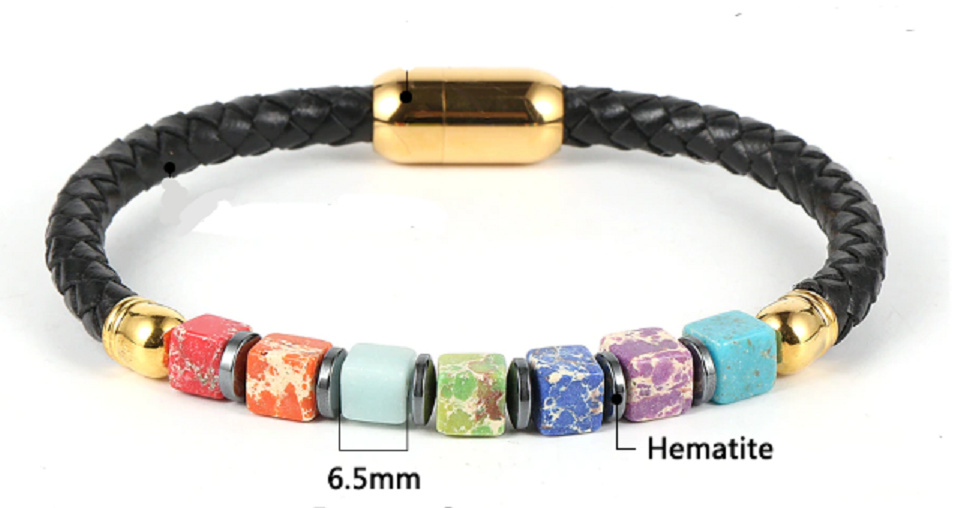 Sedm barevných korálků z polodrahokamů představuje sedm hlavních čaker. čakry jsou energetická centra umístěna podél dráhy mozkového kmene a míchy. Existuje sedm hlavních čaker, které si můžeme představit jako lotosové květy. Čím je květ rozkvetlejší, tím více je člověk ve spojení s energií duše. Krásná černá kůže působí elegantně a sofistikovaně a barevné korálky jsou hravé a pestré.